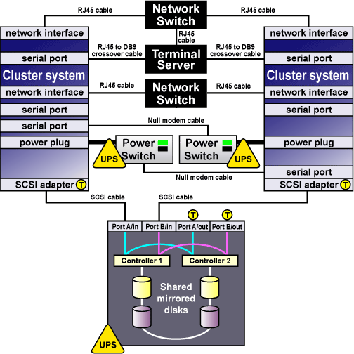 Two serversEach member includes a network interface for client access and for Ethernet connections and a SCSI adapter (termination disabled) for the shared storage connection
