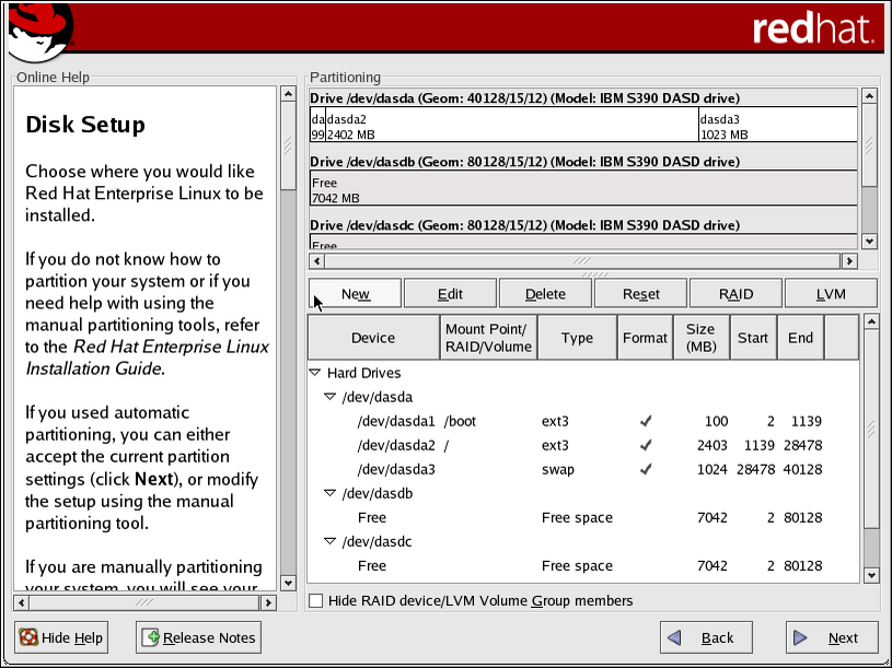 Above the display, you can review the Drive name (such as /dev/dasda), the Geom (which shows the hard disk's geometry and consists of three numbers representing the number of cylinders, heads, and sectors as reported by the hard disk), and the Model of the hard drive as detected by the installation program.