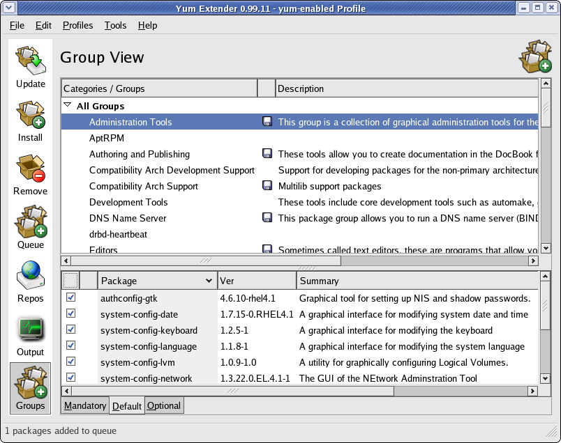 The Package Window has a Mandatory, Default, and Optional tab. Each tab contains a list of packages for that category in the Group that is selected in the Group Window. Mandatory and default packages are installed when a group is installed, optional packages are not.