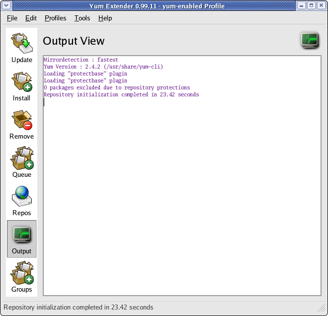 There is a row of Buttons on the left side of Yum Extender to control the section of the program you will enter. Yum Extender starts in the Output Section. This section is where commands write their output.