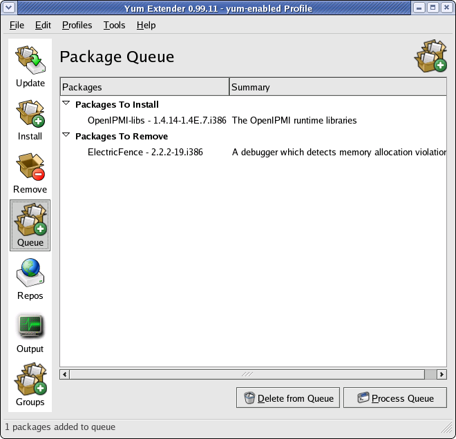 To enter this section, you would press the Queue button on the left side of Yum Extender. You will see a list of actions that are going to be accomplished as selected in the Update, Install, or Remove sections listed above. If there are actions listed in the Queue that you do not want to take place, you can select that transaction and use the Delete from Queue button to remove it from the Yum Extender Queue.